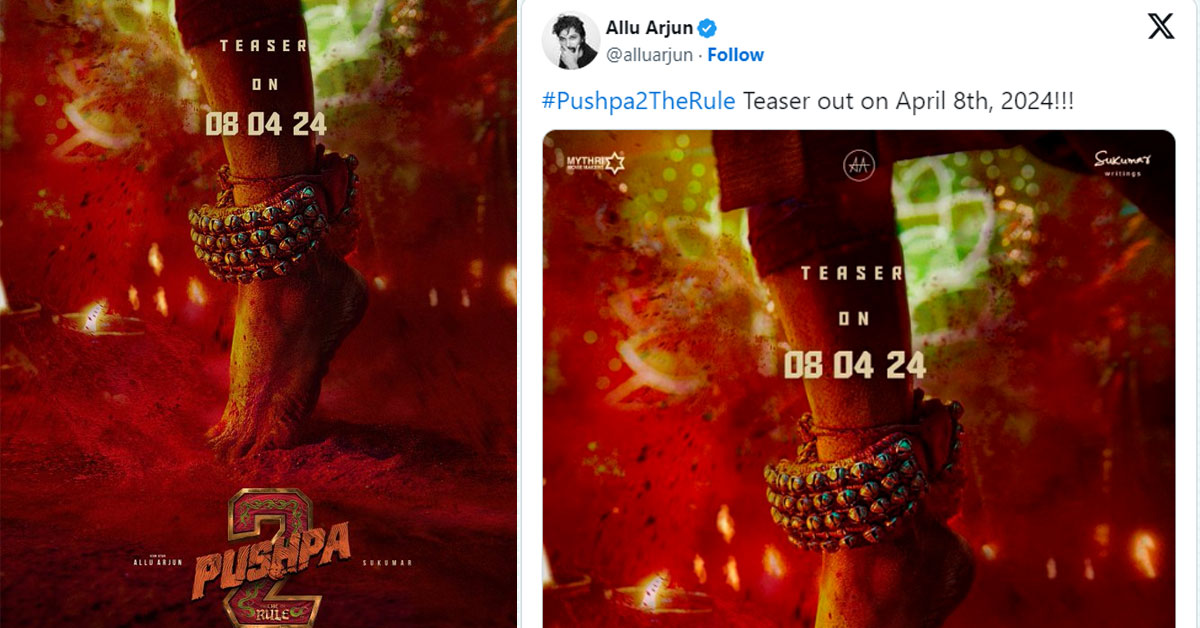 പുഷ്പ 2വിന്റെ പുതിയ അപ്ഡേറ്റ് പങ്കുവച്ചിരിക്കുകയാണ് നടൻ അല്ലു അര്ജുന്. ‘പുഷ്പ 2 ദ റൂൾ’ ടീസര് ഏപ്രില് 8ന് പുറത്തുവിടും എന്നാണ് താരം സോഷ്യൽ മീഡിയയിലൂടെ പങ്കുവെച്ചിരിക്കുന്നത്.അല്ലു അർജുൻ ആരാധകർ ഏറെ പ്രതീക്ഷയോടെ കാത്തിരിക്കുന്ന സിനിമയാണ് ‘പുഷ്പ 2: ദി റൂൾ’. ഇപ്പോഴിതാ ചിത്രത്തിന്റെ വൻ അപ്ഡേറ്റ് ആണ് പുറത്തു വന്നിരിക്കുന്നത്.ചിലങ്ക കെട്ടിയ ഒരു കാലിൻറെ ചിത്രം മാത്രമാണ് ടീസർ റിലീസ് പോസ്റ്ററിൽ ഉള്ളത്.