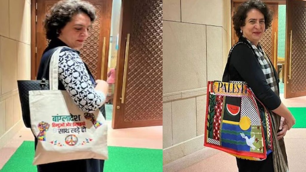 ബംഗ്ലാദേശിലെ ന്യൂനപക്ഷങ്ങൾക്കായി പ്രിയങ്ക ഗാന്ധി രംഗത്ത്. ബംഗ്ലാദേശിന് ഐക്യദാർഢ്യം രേഖപ്പെടുത്തിയ ബാഗുമായാണ് പ്രിയങ്ക ഇന്ന് പാർലമെൻറിൽ ഇന്നെത്തിയത് . ബംഗ്ലാദേശിലെ ഹിന്ദുക്കൾക്കും ക്രിസ്ത്യാനികൾക്കുമൊപ്പം എന്നാണ് ബാഗില് എഴുതിയിരിക്കുന്നത്.എന്നാൽ കഴിഞ്ഞ ദിവസം പ്രിയങ്ക പ ലസ്തീന് ഐക്യദാർഢ്യം പ്രകടിപ്പിക്കുന്ന ബാഗുമായുമാണ് പാർലമെന്റിൽ എത്തിയിരുന്നത്, ഇതിന് ചൊല്ലി നിരവധി വിമർശനം ഉയർന്നിരുന്നു, എന്നാൽ പലസ്തീൻറെ കൂടെ നില്ക്കുന്ന പ്രിയങ്ക എന്തു കൊണ്ട് ബംഗ്ലാദേശിലെ ഹിന്ദുക്കൾക്കായി ശബ്ദം ഉയർത്തുന്നില്ലെന്ന് ബിജെപി നേതാവ് സംപിത് ബാത്ര ചോദിച്ചു.