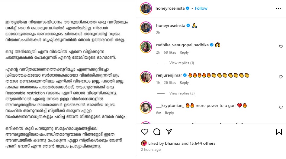 അതുകൊണ്ടു എന്റെ നേരെയുള്ള വിമര്ശനങ്ങളില് അസഭ്യ അശ്ലീല പരാമര്ശങ്ങള് ഉണ്ടെങ്കില് ഭാരതീയ ന്യായസംഹിത അനുസരിച്ച് സ്ത്രീക്ക് തരുന്ന എല്ലാം സംരക്ഷണ സാധ്യതകളും പഠിച്ച് ഞാന് നിങ്ങളുടെ നേരെ വരും. ഒരിക്കല് കൂടി പറയുന്നു സമൂഹമാധ്യമങ്ങളിലെ അസഭ്യ അശ്ലീല ഭാഷാപണ്ഡിത മാന്യന്മാരെ നിങ്ങളോട് അതേ അവസ്ഥയില് കടന്നുപോകുന്ന എല്ലാ സ്ത്രീകള്ക്കും വേണ്ടി ഹണി റോസ് എന്ന ഞാന് യുദ്ധം പ്രഖ്യാപിക്കുന്നു’, ഹണി റോസ് പറഞ്ഞു. അതേസമയം കഴിഞ്ഞ ദിവസം ഹണി റോസിന്റെ പോസ്റ്റിന് അടിയിൽ അശ്ലീല കമന്റ് ഇട്ടവർക്കെതിരെ ഹണി റോസ് പോലീസിൽ പരാതിപ്പെട്ടിരുന്നു. ഇതിന്റെ അടിസ്ഥാനത്തില് പോലീസ് ഒരു പ്രതിയെ അറസ്റ് ചെയ്തിരുന്നു.