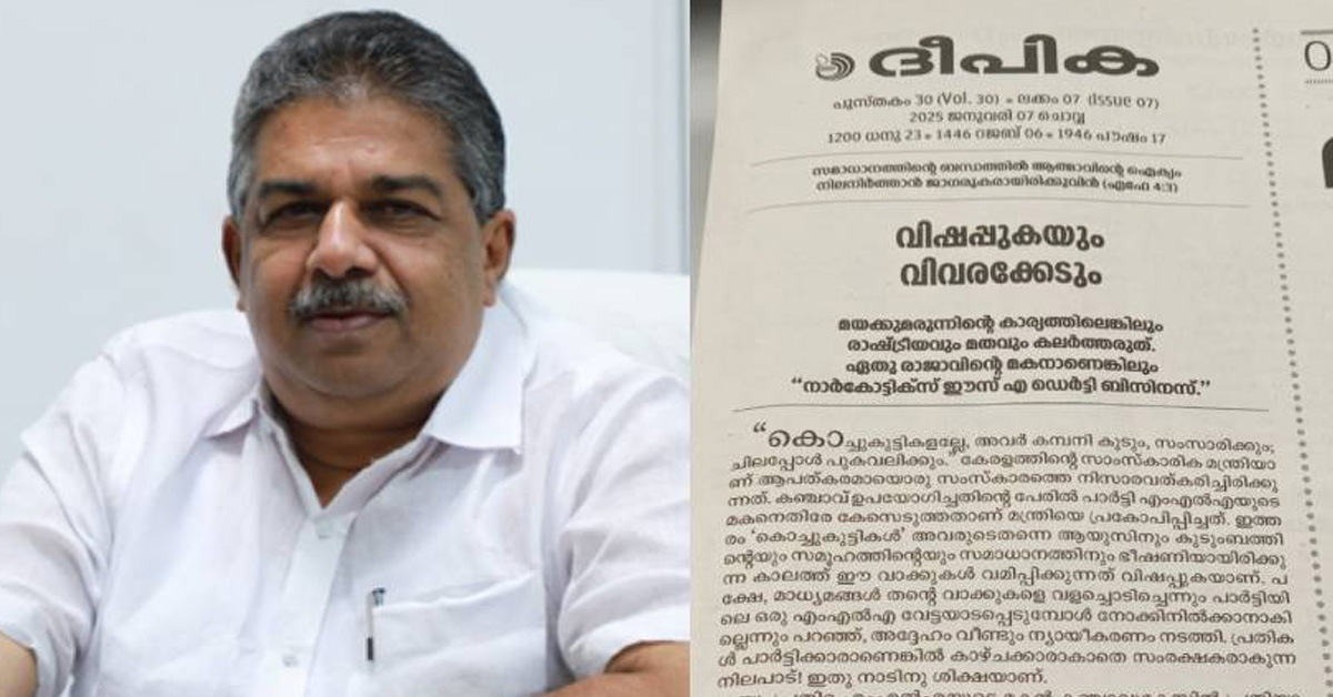 യു പ്രതിഭ എംഎൽഎയുടെ മകന്റെ കഞ്ചാവ് കേസുമായി ബന്ധപ്പെട്ട് കുട്ടികളുടെ ലഹരി ഉപയോഗത്തെ നിസാരവത്ക്കരിച്ച മന്ത്രി സജി ചെറിയാനെതിരെ ദീപിക പത്രം. വിഷപ്പുകയും വിവരക്കേടും എന്ന പേരിൽ എഡിറ്റോറിയൽ. മയക്കുമരുന്നിൻ്റെ കാര്യത്തിൽ മതവും രാഷ്ട്രീയവും കൂട്ടി കലർത്തരുതെന്ന് ദീപിക പത്രം. ഏതു രാജാവിൻ്റെ മകനായാലും നാർക്കോട്ടിക്സ് ഈസ് എ ഡെർട്ടി ബിസിനസെന്ന് എഡിറ്റോറിയൽ. മന്ത്രിയുടെ വാക്കുകൾ വമിപ്പിക്കുന്നത് വിക്ഷപ്പുകയെന്ന് വിമർശനം.എംഎൽഎയെ പിന്തുണക്കാൻ അവകാശമുണ്ട് എന്നാൽ കുറ്റക്കാരെ ന്യായീകരിച്ചത് ശരിയല്ലെന്നാണ് ദീപിക പത്രത്തിലെ എഡിറ്റോറിയലിൽ പറയുന്നത്.