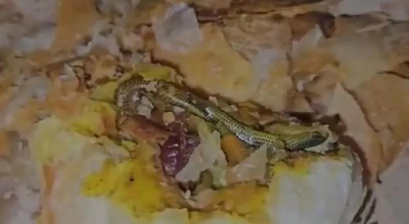 തെലങ്കാന: ബേക്കറിയിൽ നിന്നും വാങ്ങിയ പഫ്സിൽ ചത്ത പാമ്പിനെ കണ്ടെത്തി. തെലങ്കാനയിലെ മെഹബൂബ നഗറിലാണ് സംഭവം റിപ്പോർട്ട് ചെയ്തിരിക്കുന്നത്. തെലങ്കാനയിലെ ജാഡ്ചർല മുനിസിപ്പാലിറ്റിയിലെ ബേക്കറിയിൽ നിന്ന് ശീസൈല എന്ന സ്ത്രീ മുട്ട പഫ്സ് വാങ്ങി. കുട്ടികളോടൊപ്പം കഴിക്കാൻ പഫ്സ് തുറന്നപ്പോഴാണ് അതിനുള്ളിൽ ചത്ത പാമ്പിനെ കണ്ടത്.