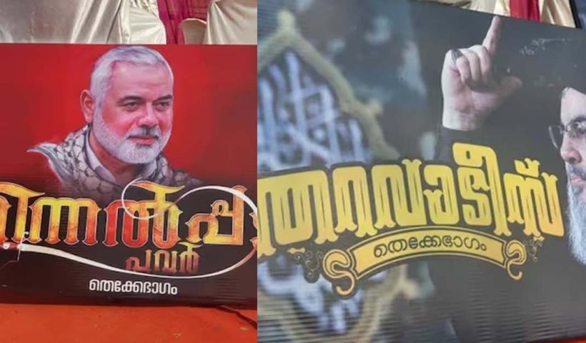 പാലക്കാട് തൃത്താലയിൽ പള്ളി ഉറൂസിൻ്റെ ഭാഗമായുള്ള ദേശോത്സവ ഘോഷയാത്രയിൽ ഹമാസ് നേതാക്കളുടെ ചിത്രങ്ങൾ പ്രദർശിപ്പിച്ചത് വ്യാപകമായ പ്രതിഷേധത്തിന് കാരണമായി. ഇസ്രായേൽ ആക്രമങ്ങളിൽ കൊല്ലപ്പെട്ട നേതാക്കളുടെ ചിത്രങ്ങൾ ഉപയോഗിച്ചുള്ള പോസ്റ്ററുകൾ നെറ്റിപ്പട്ടം കെട്ടിയ മൂന്ന് ആനകളുടെ പുറത്ത്…